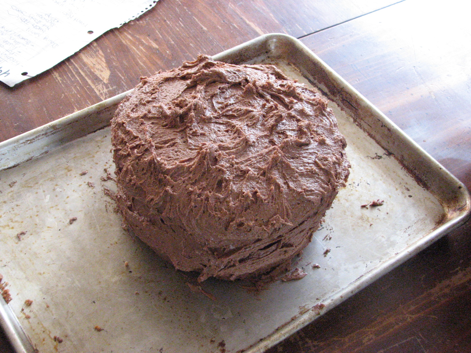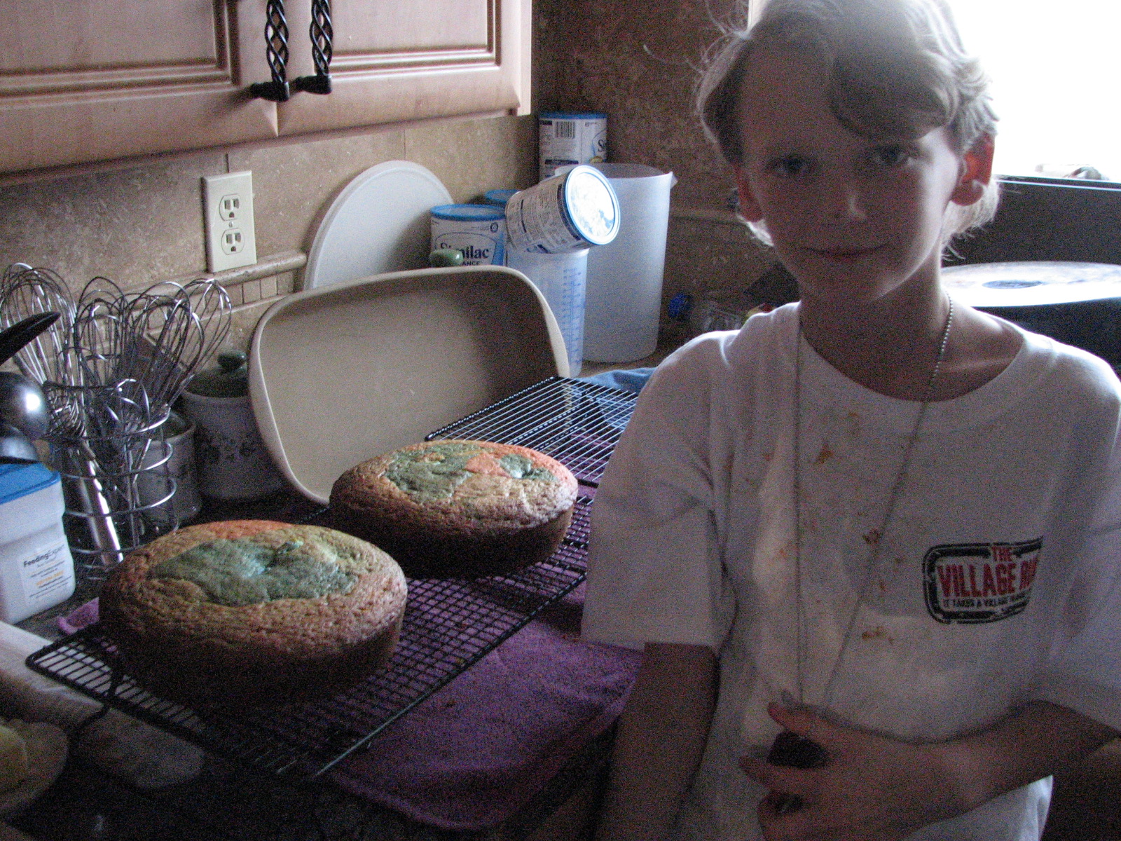 he worked hard on this. Letting it cool was hard for him because he wanted to frost it so fast afterward. He made chocolate frosting and it was a white and chocolate cake. I must say for his first time making a cake it tasted yummy.